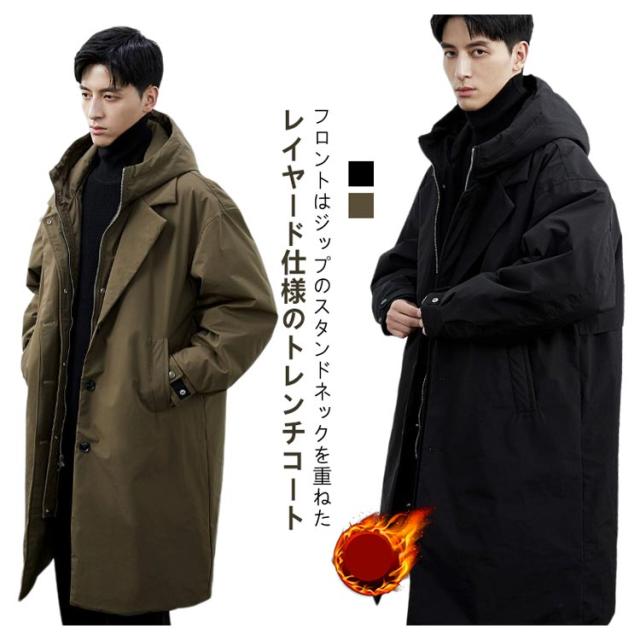 中綿 フード付き ミリタリーコート ロングコート メンズ 厚手 アウター コート ロング丈 ミリタリー レイヤード仕様 トレンチコート 大きいサイズ コート 秋冬 キルティングコート 中綿コート ジップアップ モッズコート 無地 軽量 冬服 冬物 黒 カーキ