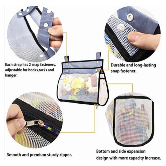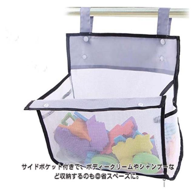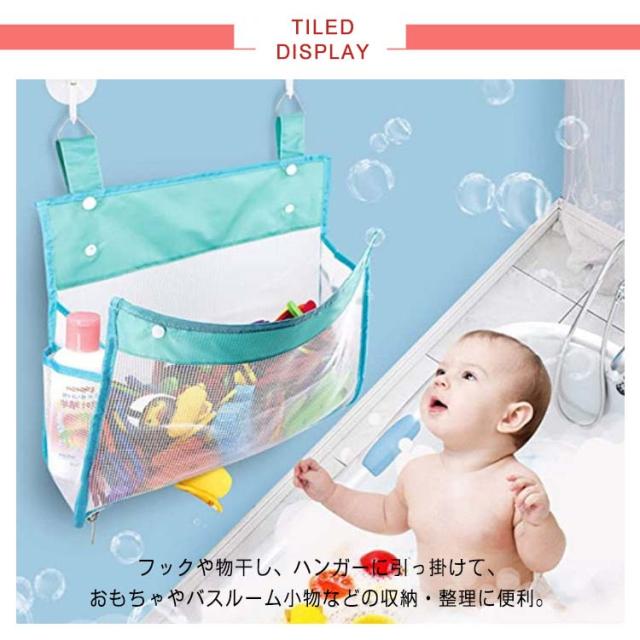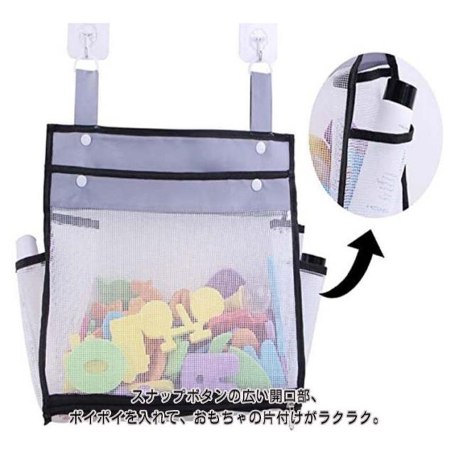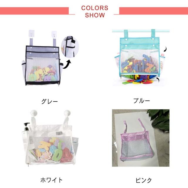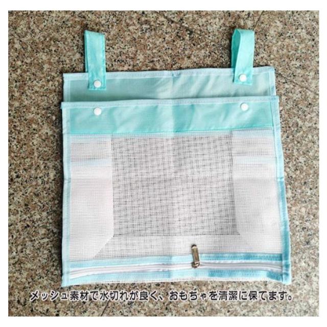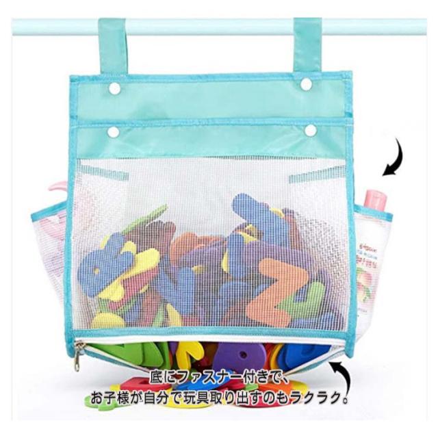 | 水切れがよいメッシュお風呂おもちゃ袋 フックや物干し、ハンガーに引っ掛けて、おもちゃやバスルーム小物などの収納・整理に便利。 底にファスナー付きで、お子様が自分で玩具取り出すのもラクラク。 スナップボタンの広い開口部、ポイポイを入れて、おもちゃの片付けがラクラク。 サイドポケット付きで、ボディークリームやシャンプーなど収納するのも◎省スペースに。 メッシュ素材で水切れが良く、おもちゃを清潔に保てます。 お風呂おもちゃ収納やお風呂用品の収納だけではなく、ベビー用品の収納、子供部屋の雑貨収納、学習用品収納、車内収納に使うこともできます。 | |