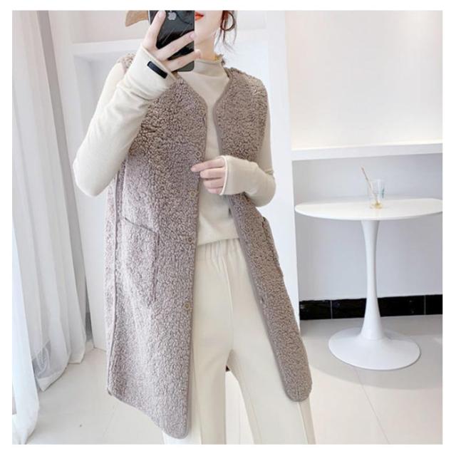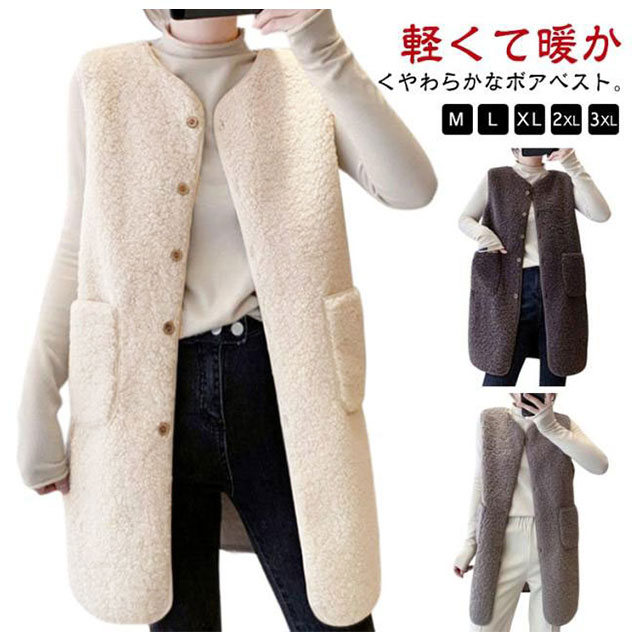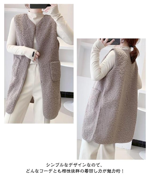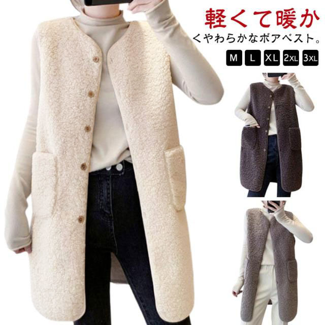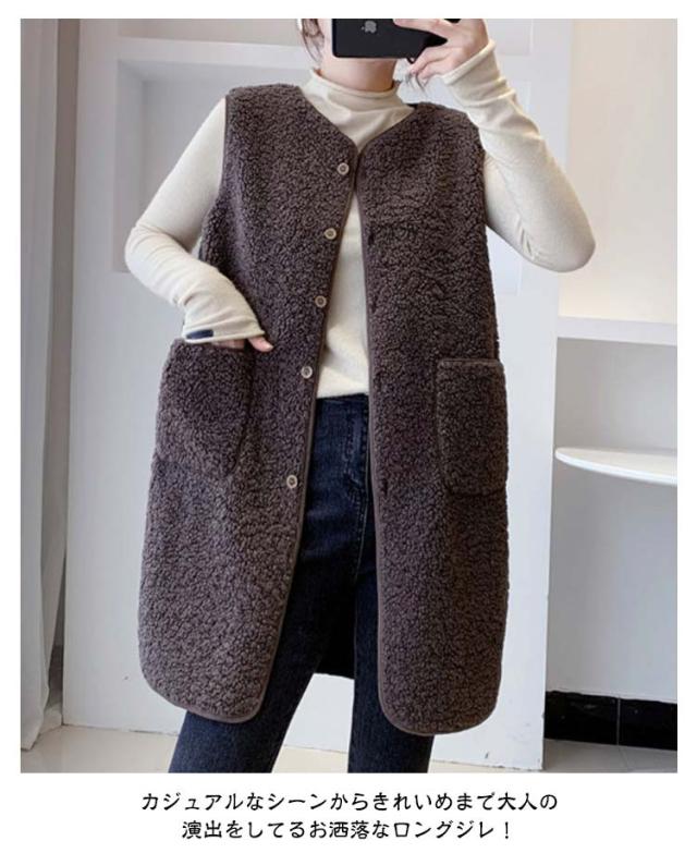ノーカラー ジレ ロングベスト ボアベスト きれいめ レディース 無地 トップス 秋 冬 ロングジレ ベスト 大きいサイズ ゆったり 大人 カジュアル OL 通勤 20代 30代 40代 50代 羽織り アウター 体型カバー ノースリーブ 重ね着 ベージュ ブラウン