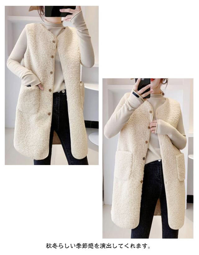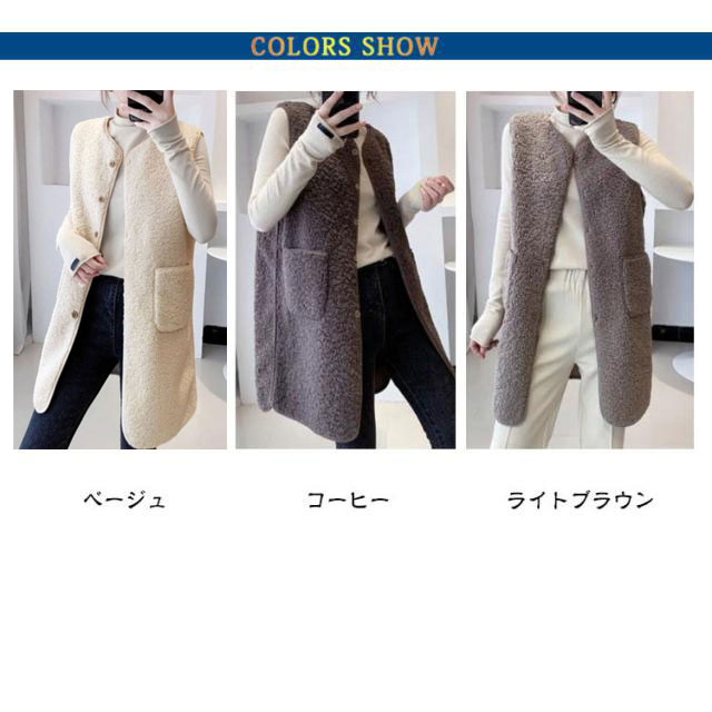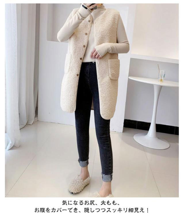 | 軽くて暖かくやわらかなボアベスト。 秋冬らしい季節感を演出してくれます。 気になるお尻、太もも、お腹をカバーでき、隠しつつスッキリ細見え! シンプルなデザインなので、どんなコーデとも相性抜群の着回し力が魅力的! カジュアルなシーンからきれいめまで大人の演出をしてるお洒落なロングジレ! | |