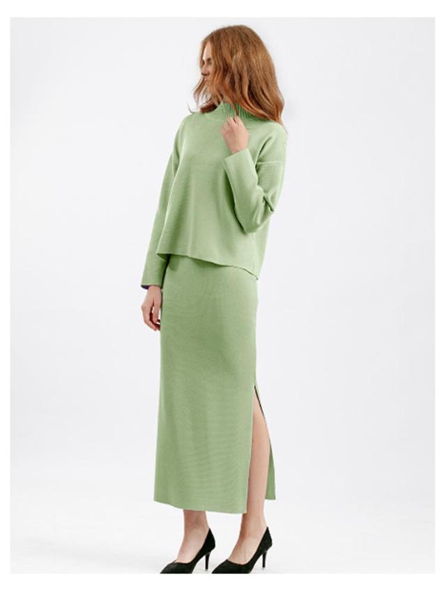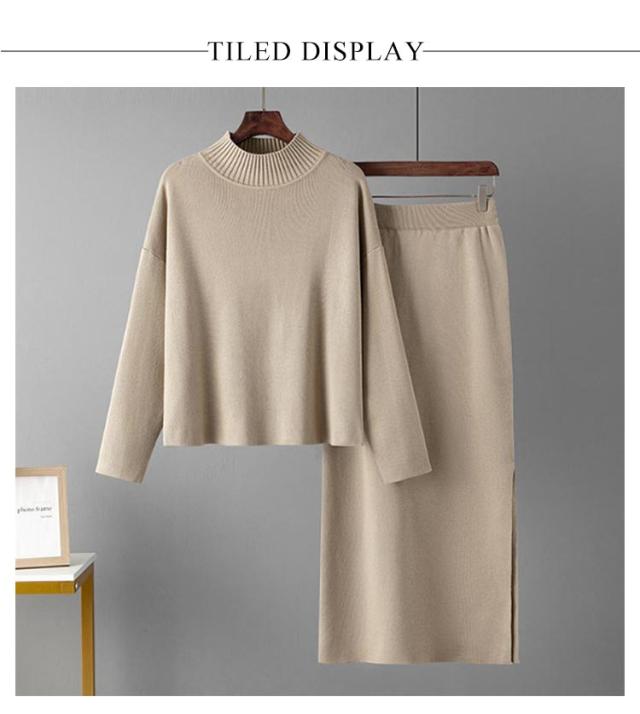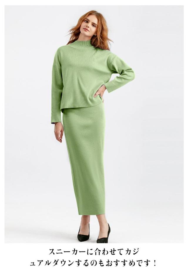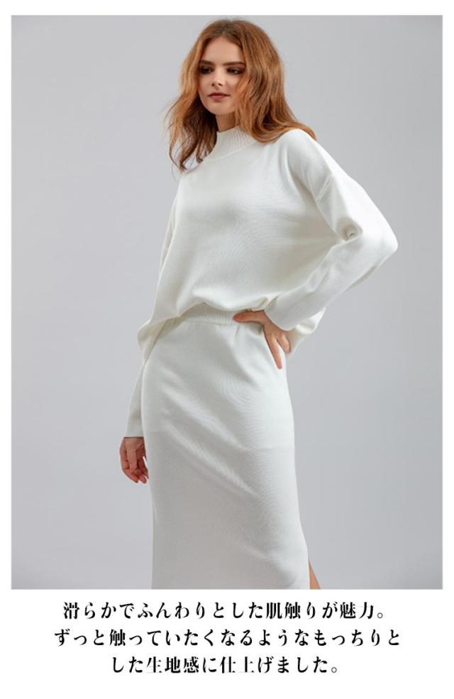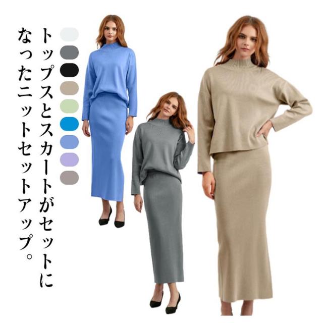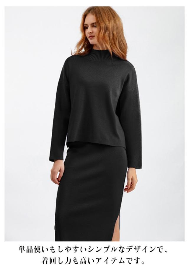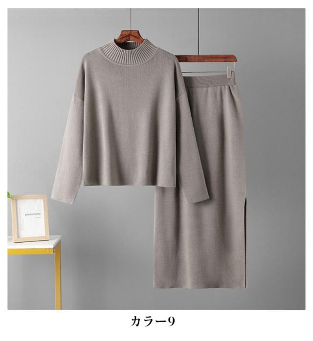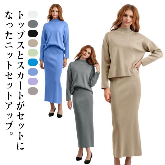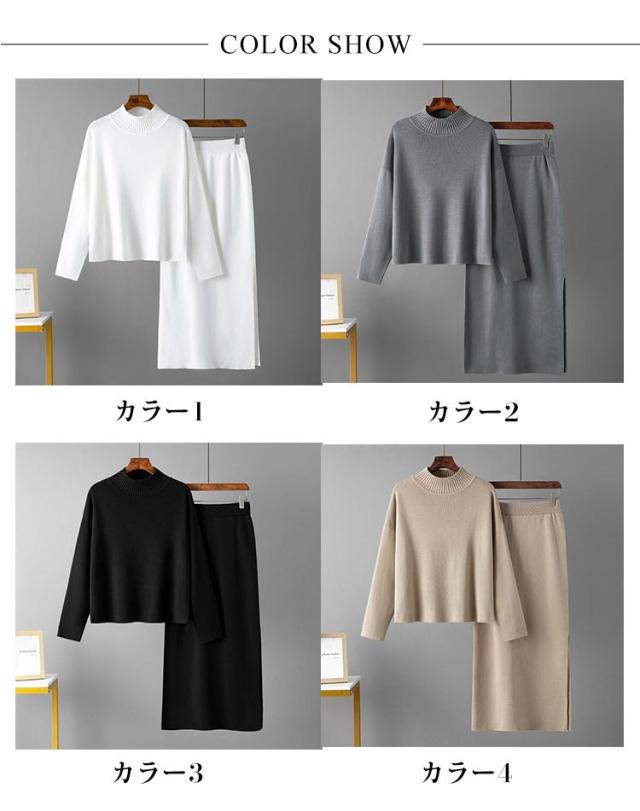 ニット ニット レディース ニットアップ スカートセット セットアップ トップス スカート プルオーバー ロングスカート スカート 長袖 ハイネック セーター ゆったり感 スリット 上下セットアップ スカートスーツ Hライン ニットスカート 無地 カジュアル 秋