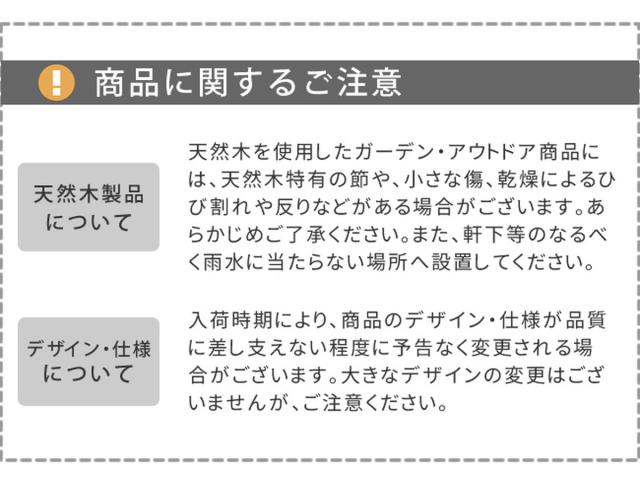 | 注意事項 | ※天然木を使用した商品は、天然木特有の節や、小さな傷、乾燥によるひび割れや反りなどがある場合がございます。あらかじめご了承ください。 ※軒下等のなるべく雨水に当たらない場所へ設置してください。 |