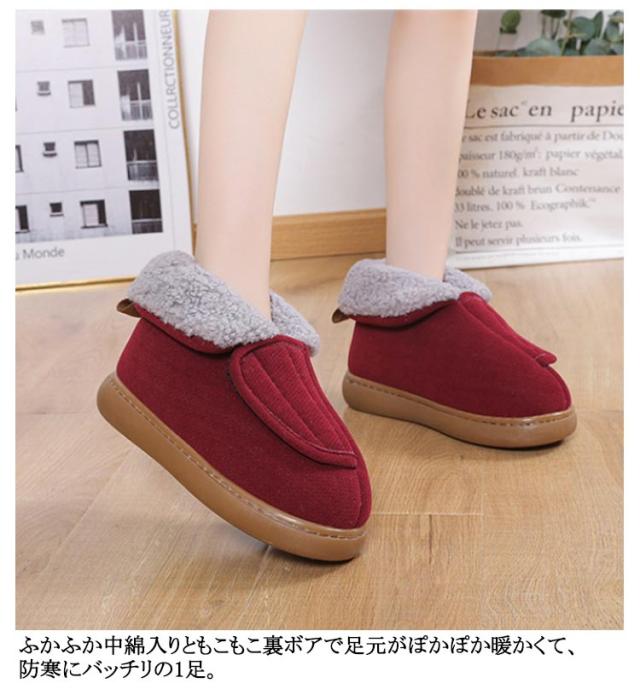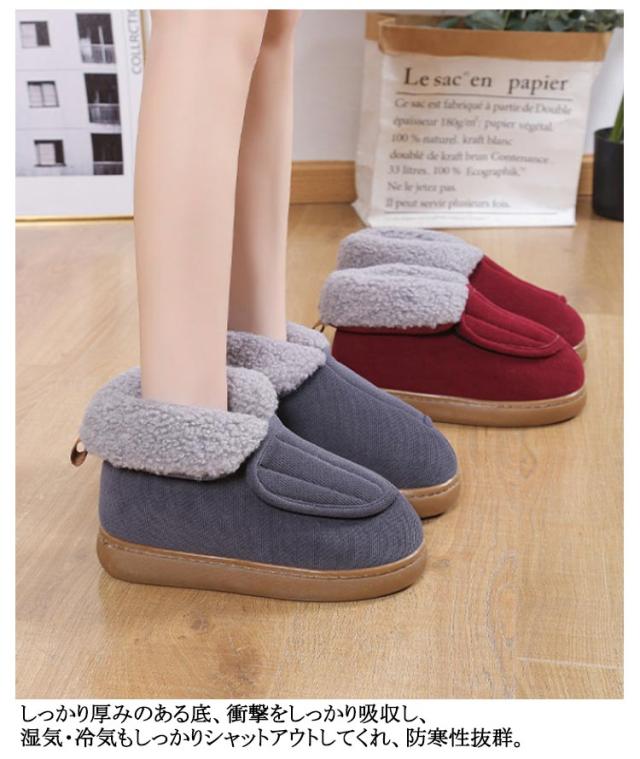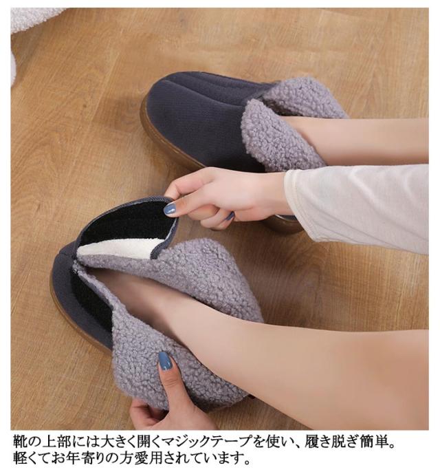 | 足首までぽかぽか暖かい冷え対策ルームシューズ。 そのまま足首を暖かく包み込んでも、折してもこもこボアを見せて、足元に華やかさをプラスしてもおしゃれな防寒シューズ。 靴の上部には大きく開くマジックテープを使い、履き脱ぎ簡単。軽くてお年寄りの方愛用されています。 窮屈感が少ない、ゆったり幅広設計、甲高さんも快適に履くことができマジックテープを採用。 高齢者の足の形に合わせて自由に調節できるゆとり・快適足を圧迫せず、着脱に便利。 アウトソールは滑りにくい素材と波浪デザインの滑り止めを付けて、スリップを予防します。 しっかり厚みのある底、衝撃をしっかり吸収し、湿気・冷気もしっかりシャットアウトしてくれ、防寒性抜群。 ふかふか中綿入りともこもこ裏ボアで足元がぽかぽか暖かくて、防寒にバッチリの1足。 室内外、病院、院内・施設、捻挫の靴、骨折外出靴、足にけがをした、高齢者の方、糖尿病患者、足に腫れやむくみのある方、外反母趾、甲高・幅広の方、介護用、リハビリ用、院内用靴、手術後、など様々な場面に適応。 | |