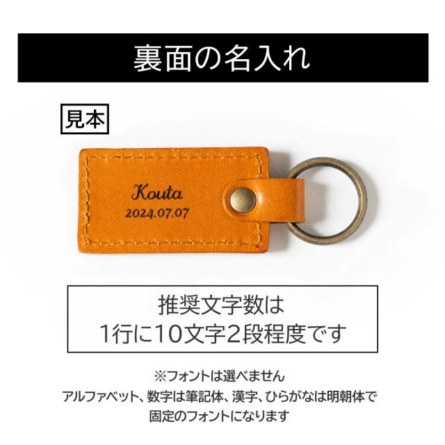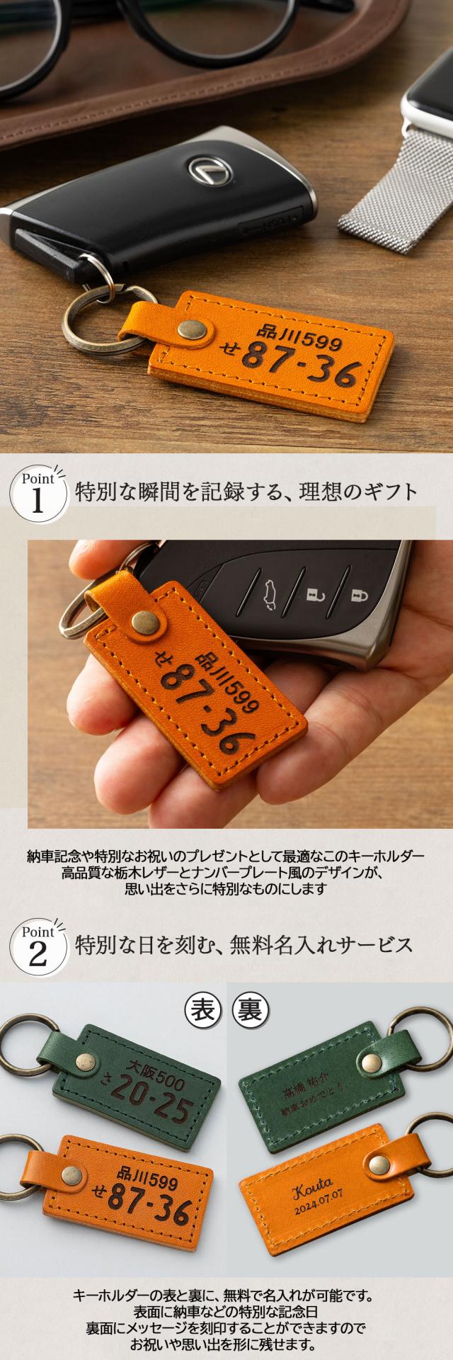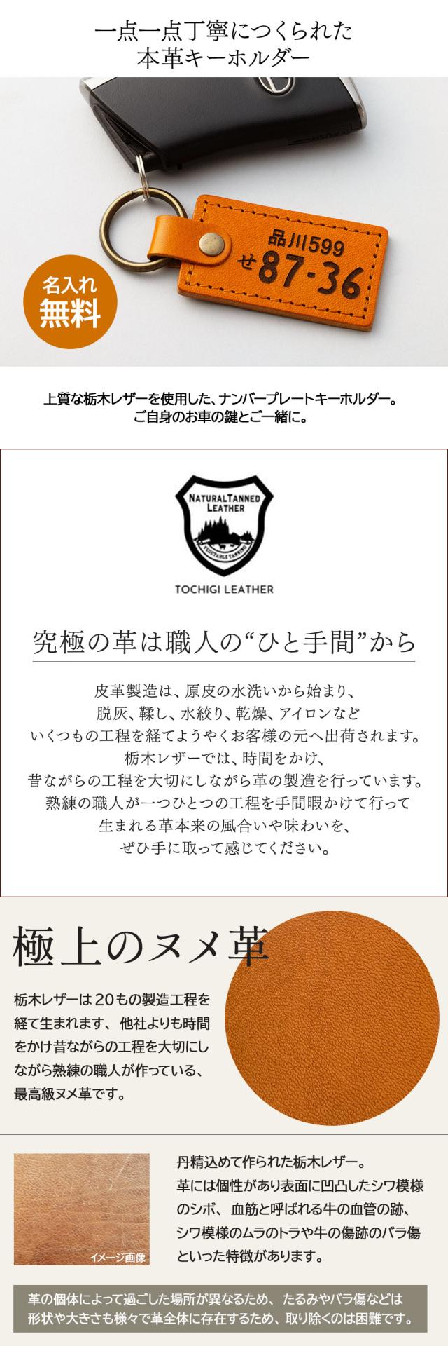 | 商品詳細 | 栃木レザー製のキーホルダー。表側にはナンバープレートデザイン、裏側に名入れ無料でギフトにもおすすめです。 |