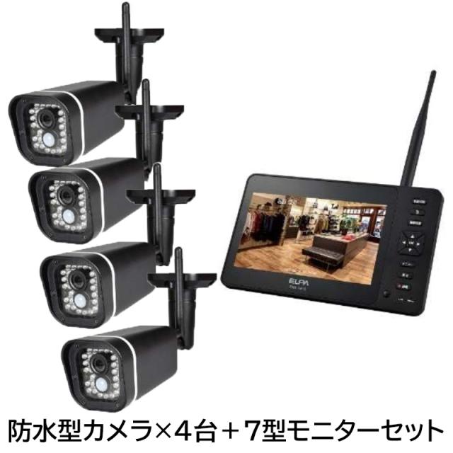 ELPA 防犯カメラ ワイヤレス モニター付き 屋外対応 録画機能付き 家庭用 7型モニター + 防水カメラ ×4台セット 4台まで接続可 CMS-H7210+CMS-HC73(3台) 送料無料