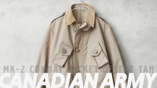 カナダ軍で1990年代に採用されたMK-2 コンバット ジャケット DESERT TANが入荷しました。砂漠などの乾燥した地域での着用を目的に製造されたデザートタンカラーのジャケットです。地上兵士(GROUND SOLDIER:GS)が着用していたジャケットで、カナダ軍に多く見られるスロットボタン(パラシュートボタン)や、胸にはライフルのマガジンを収納するために傾斜がつけられたポケットが特徴で、ウエスト部分の大型フラップポケットはマチ付きで内部は仕切られており収納に便利な仕様となっています。