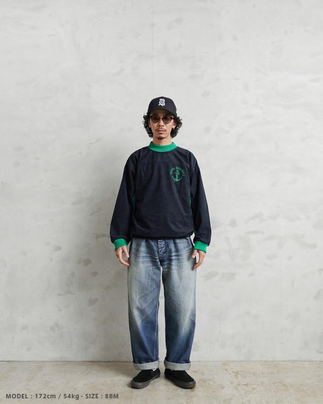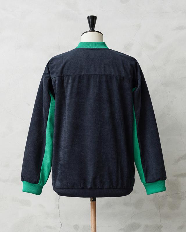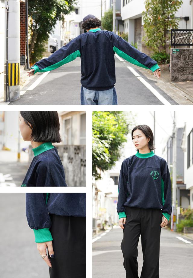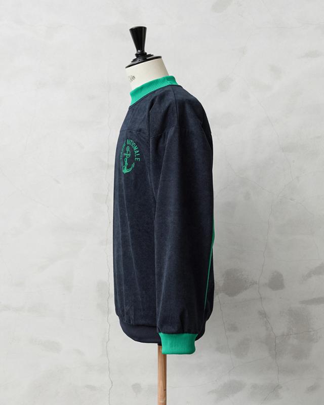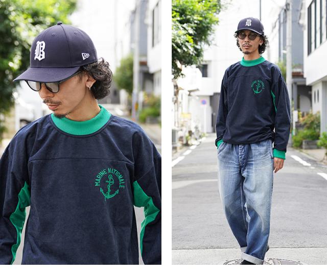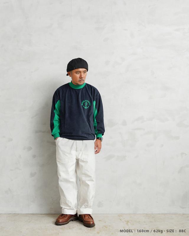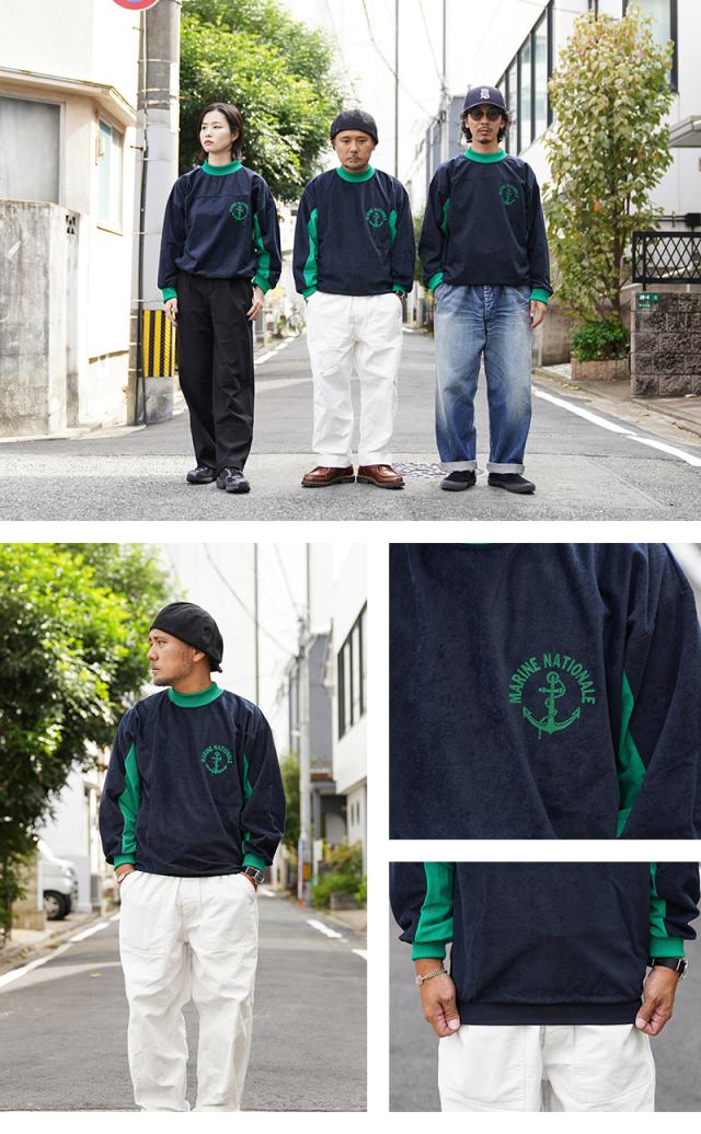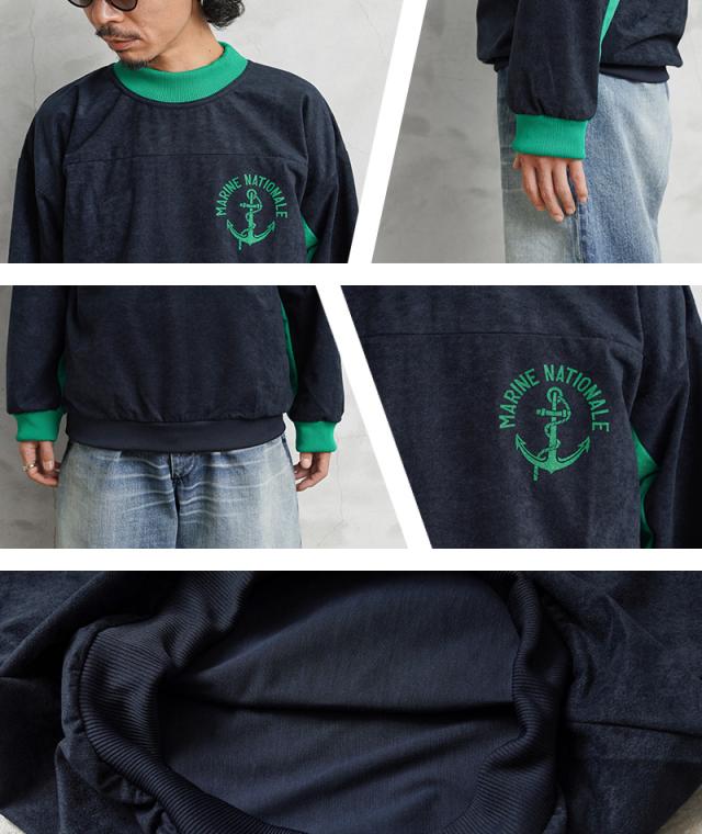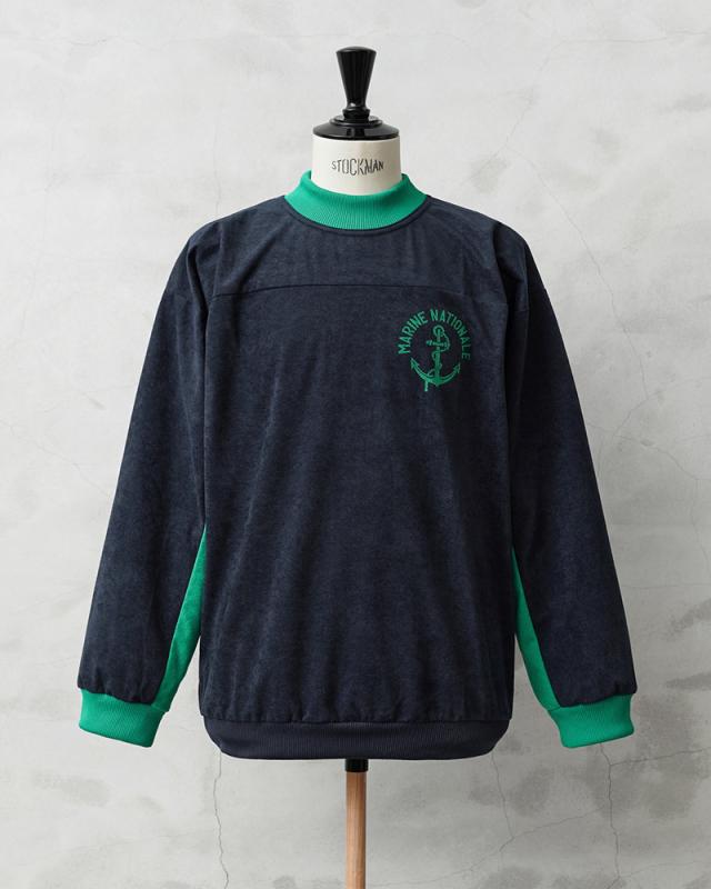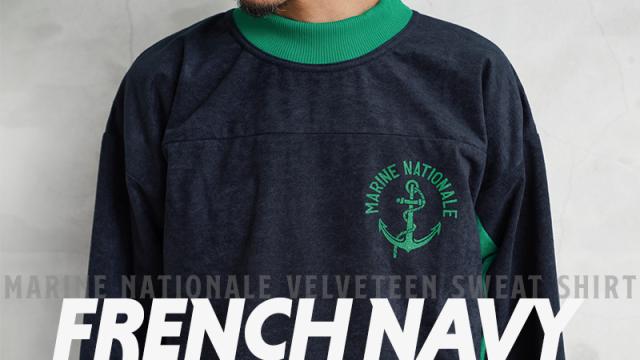 フランス海軍でトレーニングやウォームアップなどでの使用を目的に1990年代後半に採用されたスウェットシャツが入荷しました。MARINE NATIONALEとアンカーのロゴが胸にプリントされた人気のロゴデザインです!2000年代に製造されたアイテムが多く入荷しています。日本では別珍(ベッチン)という名前で知られている、正式にはVELVETEEN(ベルベティーン)という素材を使用したトレーニングスウェットシャツで、鮮やかなネイビーとグリーンのメリハリの効いたバイカラーです。別珍素材のスウェットタイプはかなり珍しいデザインなのでファッション性が高く、カジュアルなスタイルにもハマる、90’sの雰囲気を感じさせるアイテムです!