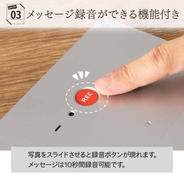 | 商品詳細 | 名入れ無料の音声付きフォトフレームクロック。ボタンを押して録音可能で、声も届ける贈り物として最適。写真の入れ替えも簡単です。 |