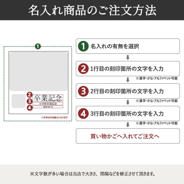 名入れ / 名いれ / ないれ / 名前 / 名前入 / 名前入り / 名前入れ / 彫刻 / 刻印 / 文字入れ / ネーム入れ / 印刷 といったように表現が異なりますが、当店では全てを総称して「 名入れ 」と表記しております。 |