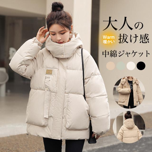 中綿ジャケット レディース 中綿コート ダウンジャケット ショート丈 体型カバー フード付き アウター 無地 厚手 暖かい カジュ