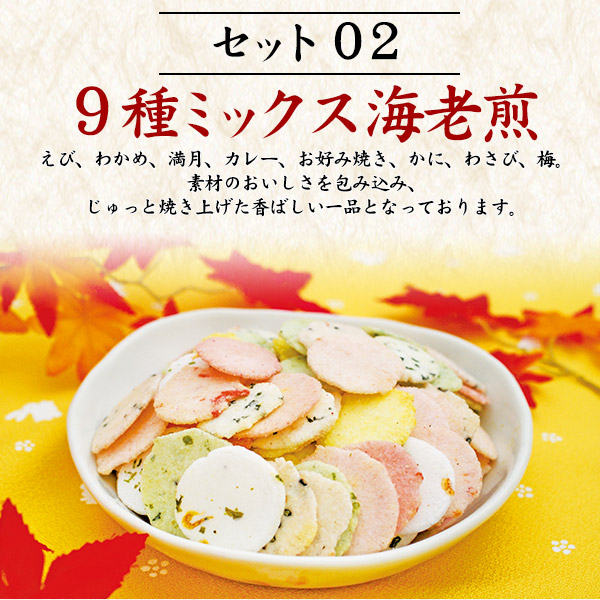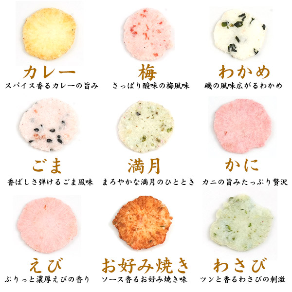 ●9種ミックス海老煎 80g×1袋えび、わかめ、ごま、満月、カレー、お好み焼き、かに、わさび、梅)