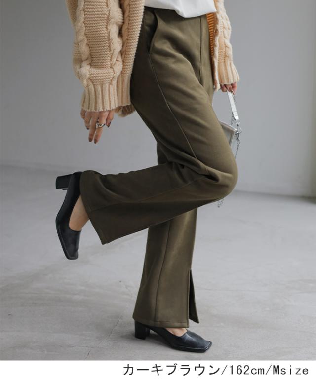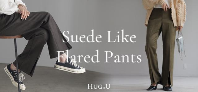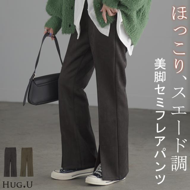 パンツ ワイド レディース フレア フレアパンツ ワイドパンツ ロング ロングパンツ スエード ボトムス ボトム ストレート ズボン ゆったり ハイウエスト スリット ゴム ライン セミフレア 美脚 体型カバー 大きいサイズ 緑 ブラウン 秋 冬 HUG.U 秋新作