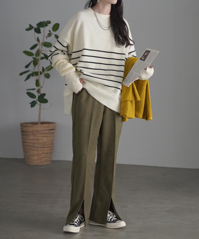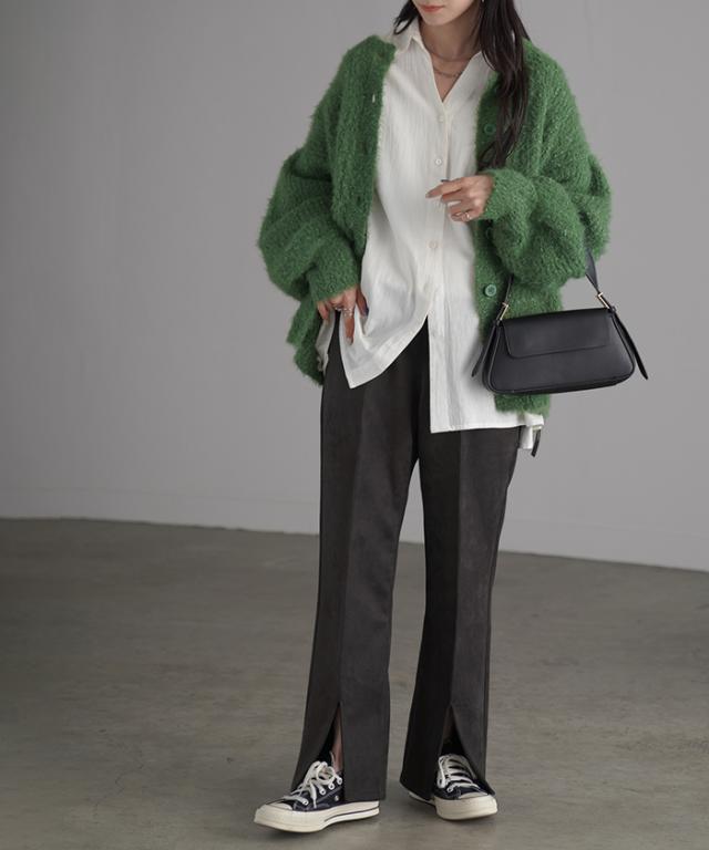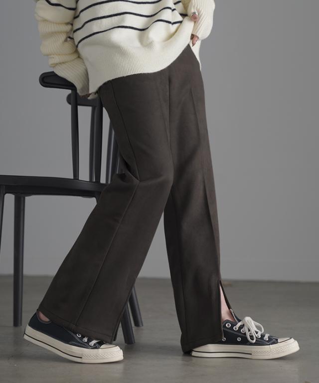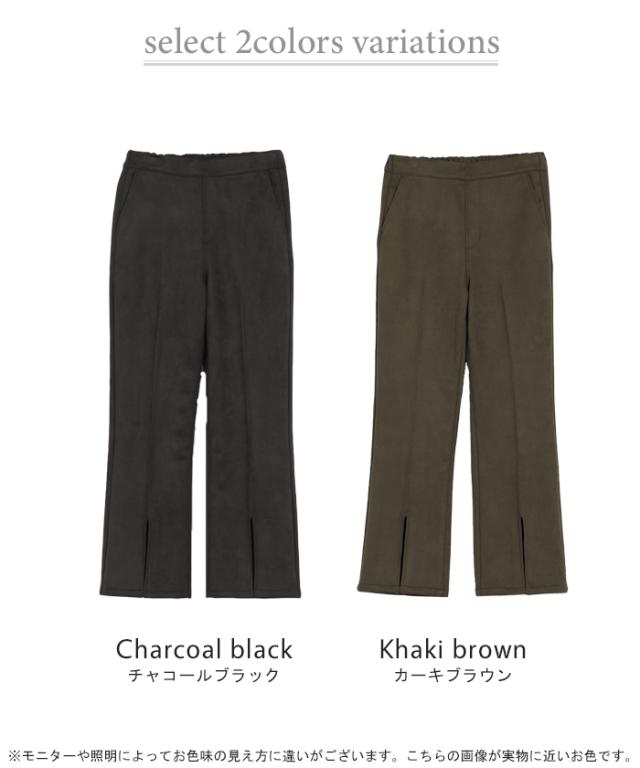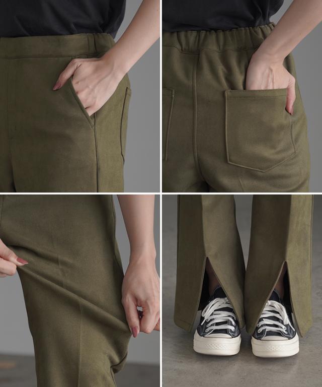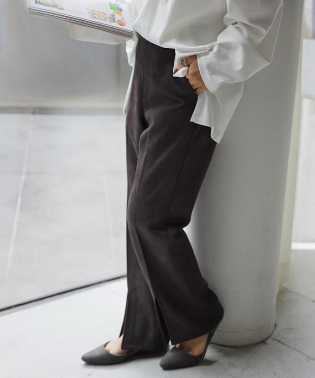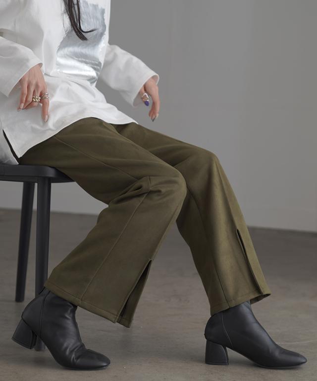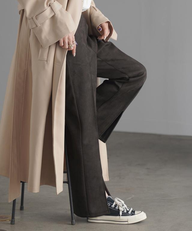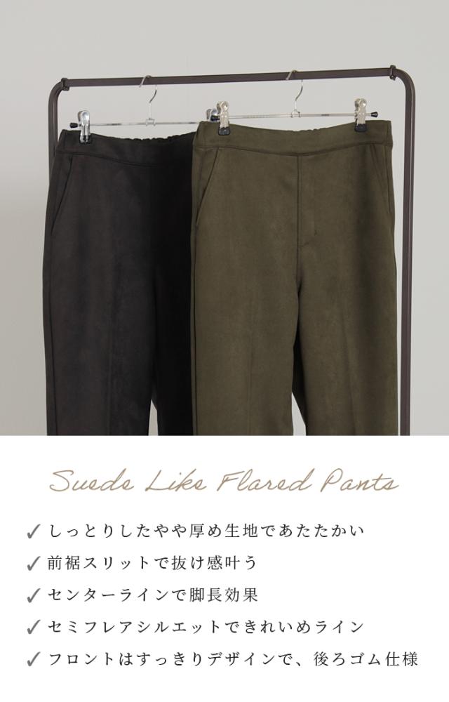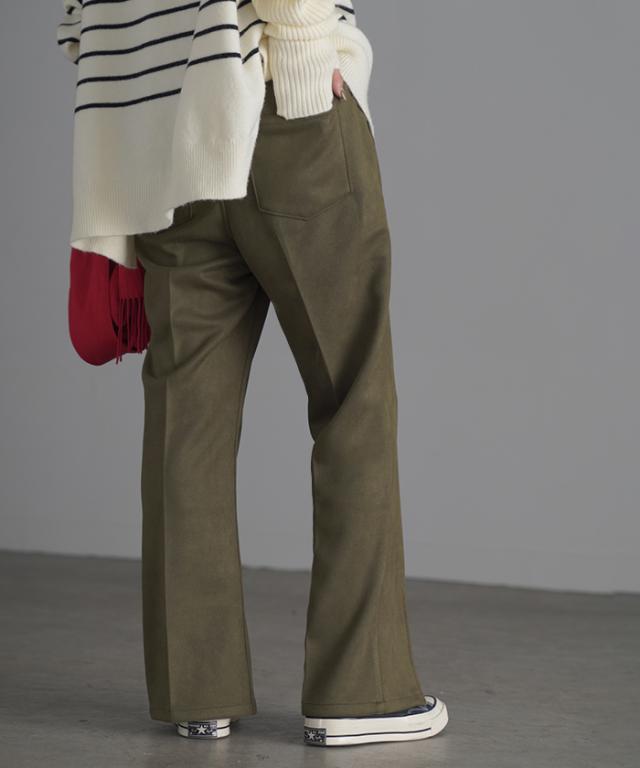フェイクスウェードの素材感が魅力のセミフレアパンツです。