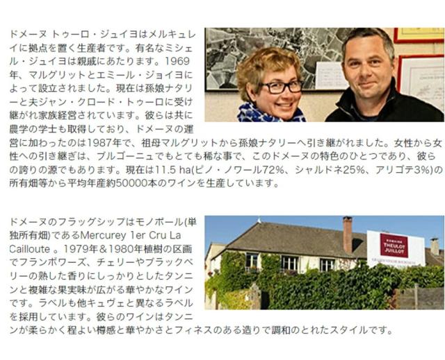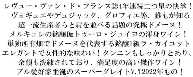 レヴュー・ヴァン・ド・フランス誌4年連続二つ星の快挙! ヴォギュエやデュジャック、グロフィエ等、誰もが知る 超一流生産者らと肩を並べる話題の究極ドメーヌ! メルキュレの銘醸Dmトゥーロ・ジュイヨの渾身ワイン! 単独所有畑でドメーヌを代表する銘醸1級ラ・カイユット エレガントで女性的な味わい!タンニンもしっかりとあり、 余韻も洗練されており、満足度の高い傑作ワイン! ブル愛好家垂涎のスーパーグレイトV.T2022年もの!