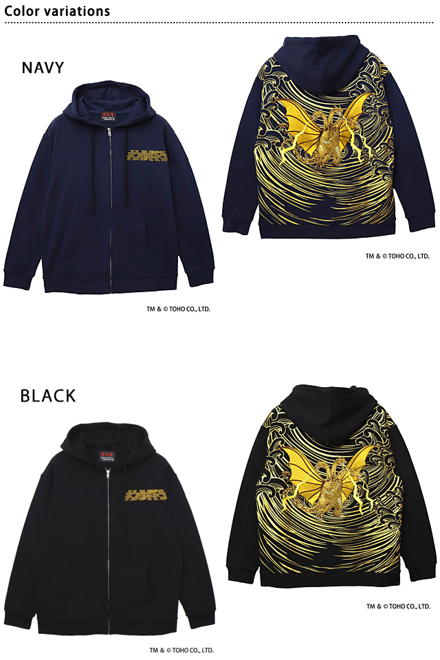 新感覚のオリエンタルブランド、錦さんから「ゴジラ×錦 キングギドラジップパーカー(564365)」のご紹介です。 日本が世界に誇る怪獣特撮映画の金字塔『ゴジラ(GODZILLA)』と花弁を使った刺繍や日本の古典文様を使った和柄デザインが人気のブランド【錦nishiki(にしき)】のコラボレーションから、スペシャルアイテムがリリースされます。 マニアや映画ファンだけでなくファッションアイテムとしても魅力的なコンテンツを模索し、メンテナンスフリーでフルシーズンのスタイリングが可能な『フルジップパーカー』を採用しました。 闇夜をイメージした二つのボディカラーをベースに、宇宙から飛来した隕石より生まれた『キングギドラ』をモチーフにデザインしました。 キングギドラの口からは稲妻の様な引力光線が吐き出され、荒々しいその姿を連想させる荒波と共に背中一面に描かれています。 フロントには、『キングギドラ』のカタカナロゴを外枠に、日本古典文様『青海波』でオマージュしたデザインを配置し、前後共にゴールドプリントととみに匠な刺繍で仕上げられております。 ファッションとしての枠を超えたスペシャルアイテムは、二つのブランドを象徴するモデルになります。 ボディに施される総刺繍はデリケートな仕様となります。 全てのデザインは刺繍技術の高さを試される匠の技で施されていますが、洗濯の際は刺繍へのダメージを軽減する為、裏返しかつネットに入れることをお勧めいたします。 また、ご愛用頂く過程で、生地自体や刺繍部分に『アタリやヤレ感、刺繍のほつれ』といったダメージが起こりえます。 これらはヴィンテージアイテムの雰囲気を実現した経年変化となり、ご自分だけの一枚としてお楽しみ下さい。 | |||||||||||||||||||||||||