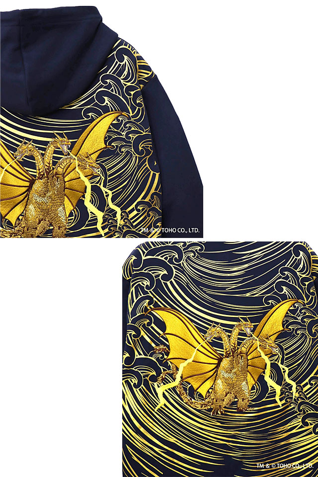 フロントには、『キングギドラ』のカタカナロゴを外枠に、日本古典文様『青海波』でオマージュしたデザインを配置し、前後共にゴールドプリントととみに匠な刺繍で仕上げられております。