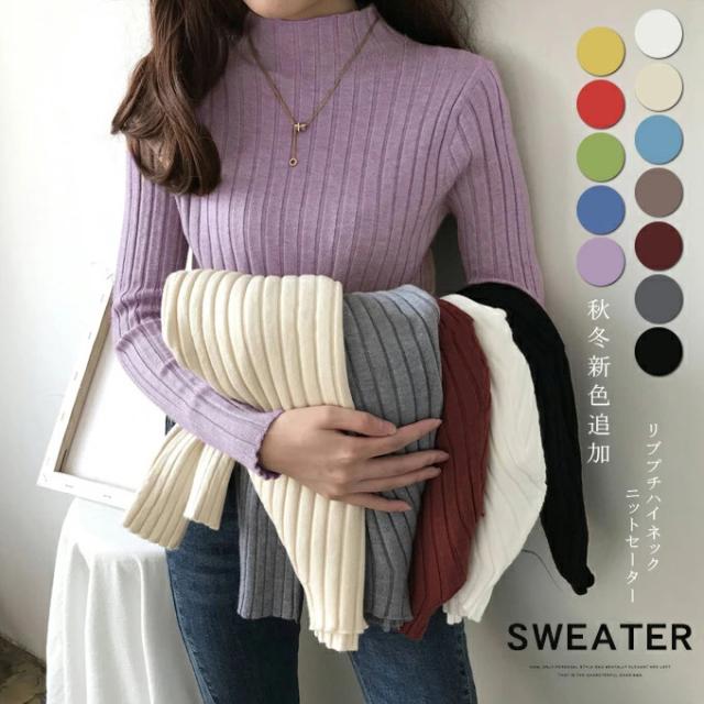 ニット セーター 長袖 レディース リブ プチハイネック プチタートルネック トップス 暖か 伸縮性あり リブニット