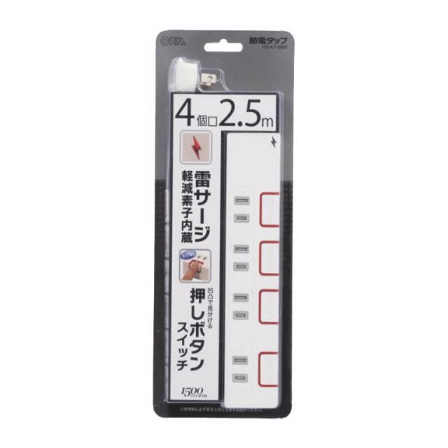 オーム HS-K1188W(00-1188) 押しボタンスイッチ付雷ガードタップ(4個口 2.5m)OHM[HSK1188W001188] 返品種別A