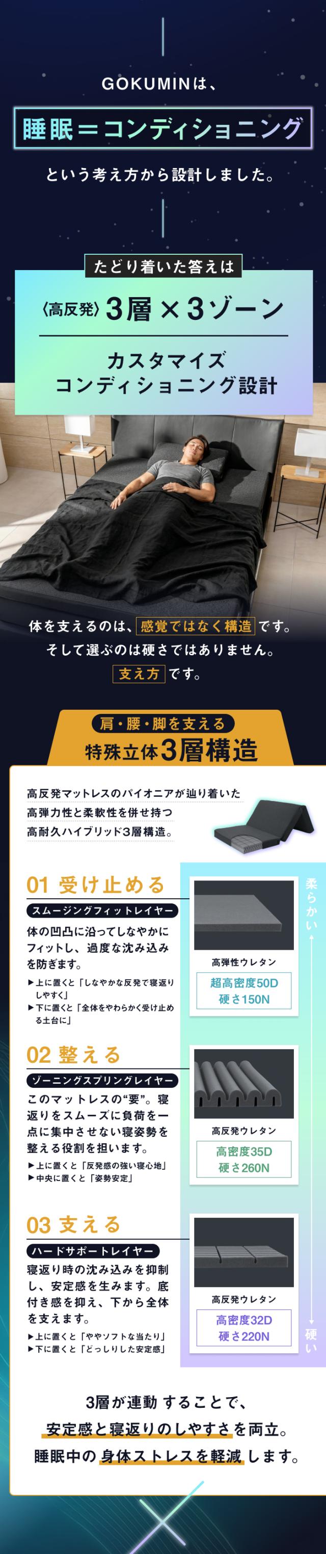 頭部・腰部・脚部の3ゾーンで、硬さ・タイプの違うウレタンを採用。3層の入れ替えで216パターンの寝心地を実現する次世代コンディショニングマットレスです。大きく開閉する裏面L字ファスナーで、層の入れ替えも簡単。