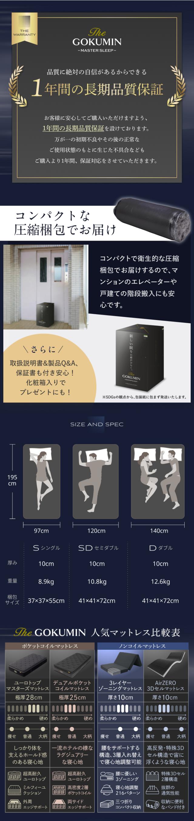 ●シングル:97cm×195cm×10cm,セミダブル:120cm×195cm×10cm,ダブル:140cm×195cm×10cm ●中材:ウレタンフォーム ●側生地 : 表生地/ポリエステル92%、ポリウレタン8%、裏生地/ポリエステル100%(滑り止め加工)、側面生地/ポリエステル100% ●カラー:チャコールグレー ●製品重量:約8.9kg ●化粧箱サイズ:37×37×55cm ●ギフトにも使える高級化粧箱 ●日本語取扱説明書 ●安心の1年間保証書 ●低ホルムアルデヒド仕様 ●開発・デザイン:日本、製造国:中国専用工場生産
