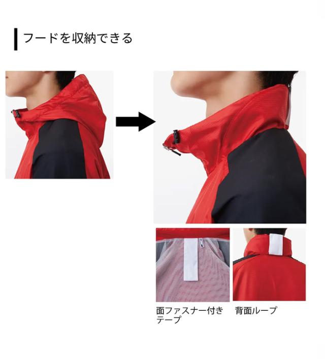 内側のテープと背面ループでフードを収納することができ、立ち襟とフーディタイプの2WAYで使用できるアイテム。
