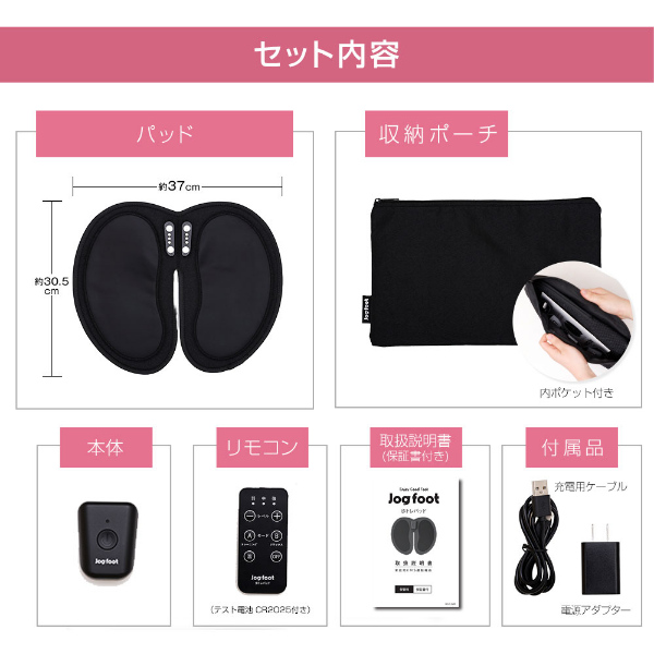 【カラー】ブラック、ピンク【セット内容】本体×1、パッド×1、リモコン(テスト電池CR2025付き)×1、充電用ケーブル×1、電源アダプター×1、収納ポーチ×1、取扱説明書(保証書付き)【サイズ】約W305×D370×H28mm/約210g(本体+パッド)【最大荷重】100kg(パッド部分)【材質】■パッド:ポリエステル、PVC、導電性シリコーン、ABS樹脂■本体:ABS樹脂■リモコン:ABS樹脂■収納ポーチ:ポリエステル【保証期間】お買い上げ日から1年間。保証は本体、リモコンのみ適応されます(充電池は消耗品のため保証対象外)。パッド及びその他の付属品には適応されません。保証の詳細は取扱説明書(保証書付き)をご確認ください。【製造国】中国【販売者】株式会社ジヴァスタジオ