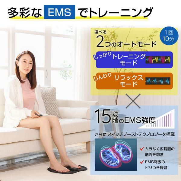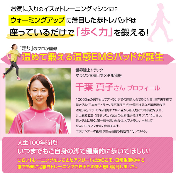 陸上長距離界のレジェンド千葉真子さんが監修した充電式コードレス温感[脚用EMSパッド]。ウォーミングアップに着目した「歩トレパッド」は、座っているだけで「歩く力」を鍛えます。温感機能で身体を温めながら、EMSで下半身の大きな筋肉を鍛えます。温感は弱、強の選べる2段階の温度でじんわり筋肉を温めます。EMSは1回10分、2つのモードが選べます。「しっかり」のトレーニングモード、「じんわり」のリラックスモード。EMS強度は15段階あり、さらにスイッチブーストテクノロジーを搭載し、EMS刺激のピリつきを軽減しながらムラなく広範囲の筋肉を刺激します。付属のリモコンで、使用中の様々な体勢でもモード、レベルの変更が簡単に行え、軽くて薄いパッドだから手軽にお好きな場所でトレーニングが可能です。