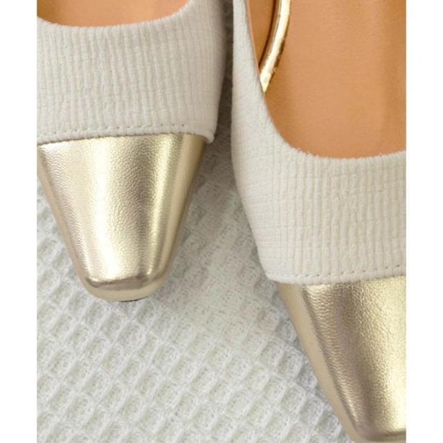 つま先には艶やかなゴールドのトゥキャップを取り入れており、モダンで洗練された印象を与える 太めのヒールで歩きやすさを追求したデザインであり、歩くたびに女性らしい足取りを演出してくれる