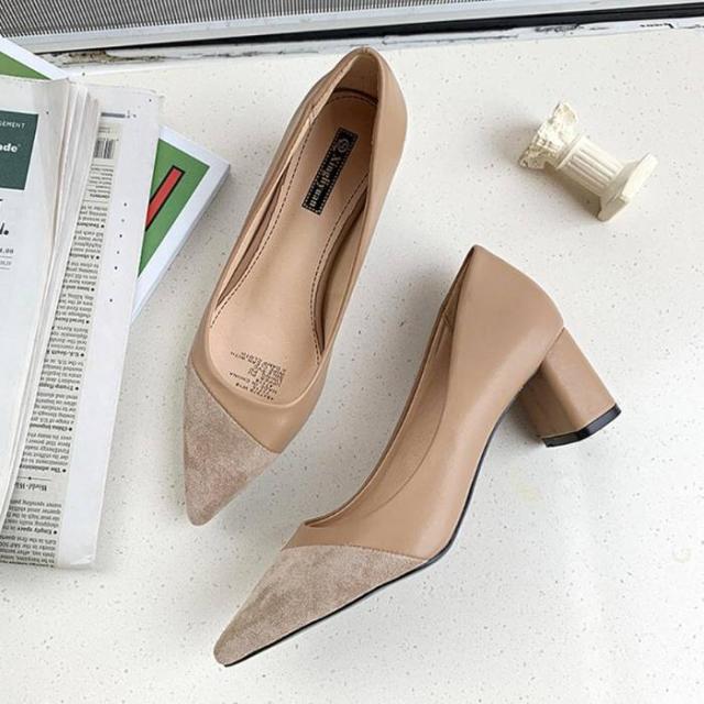 女性らしいポインテッドトゥで仕上げた、チャンキーヒールパンプスです