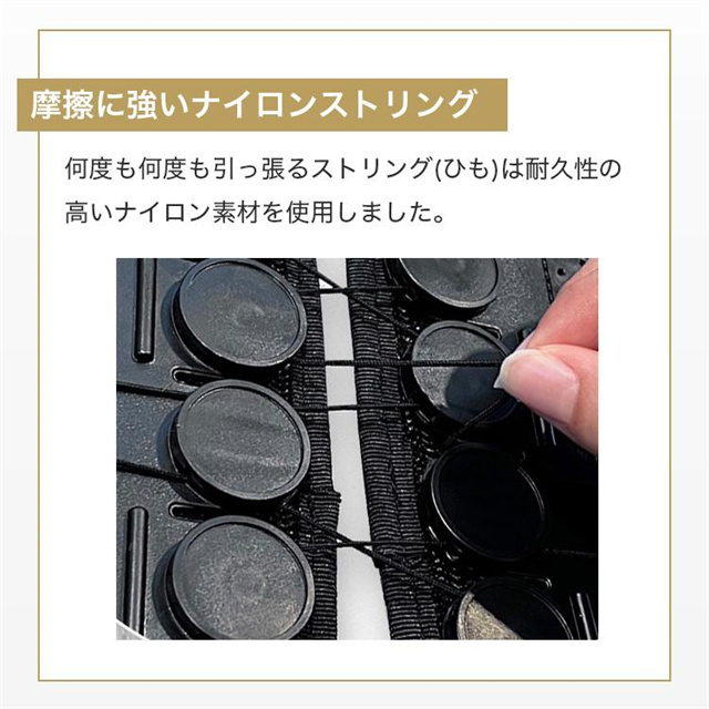 ストリングの先端は引っ張りやすい形状で、ベルトにマジックテープで固定でき加圧加減も簡単に調整できます。