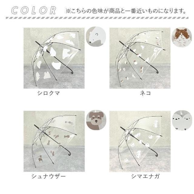 【雨の日も相棒と楽しくお出かけ】心が弾む、可愛らしいデザインが魅力☆明るい気持ちでお出かけできる「アニマルビニール傘」。【全面アニマルプリントが印象的】クリアな傘生地に、優しいタッチのアニマルプリントが映える♪愛らしい姿に心もほっこり。【いつでも簡単ワンタッチオープン】片手でサッと開きやすいジャンプ式。片手に荷物がある時もラクラク。【しなやかで丈夫!耐久性もプラス】弾力性のあるグラスファイバーと、強度の高い鉄素材の骨組。やや雨風強い日にも対応。【雨から守って使い勝手も良いサイズ】体も荷物も雨からしっかりガード!キッズや女性が普段使いしやすい、親骨58cmサイズ。【サクッと留められるボタン式バンド】傘生地を留めるバンドは、バチンっと留めやすいスナップボタン式。【軽やかで持ちやすいハンドル】軽量で扱いやすいPP製ハンドル。程よい太さで握りやすく、水濡れにも強いつくり。【選ぶのも楽しいラインナップ】通学にもお出かけにもぴったり!お気に入りの子を選んで、気分を上げよう☆