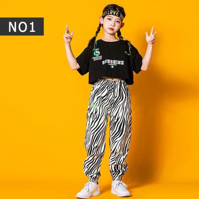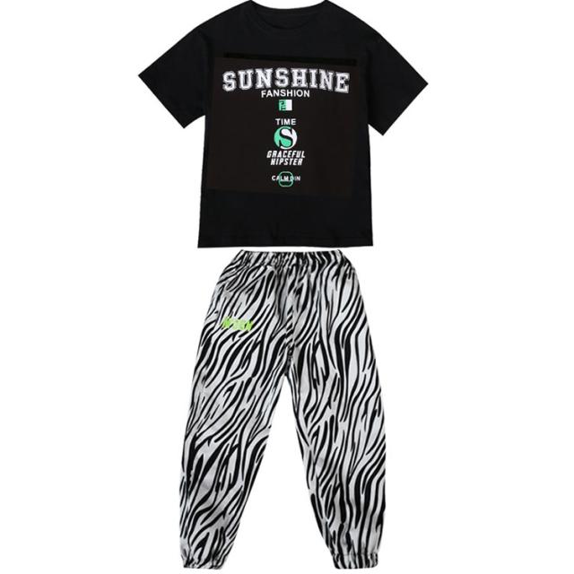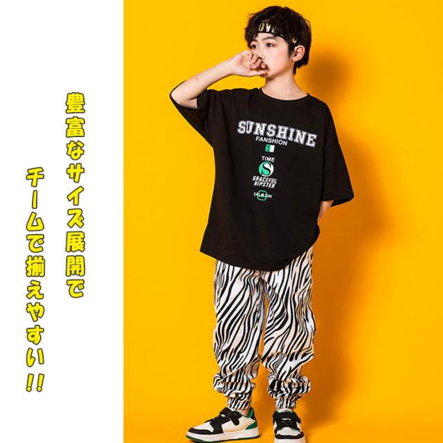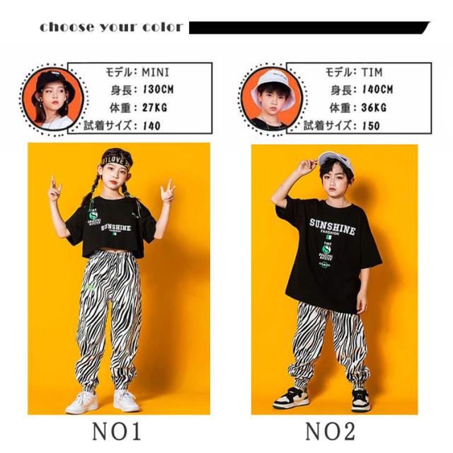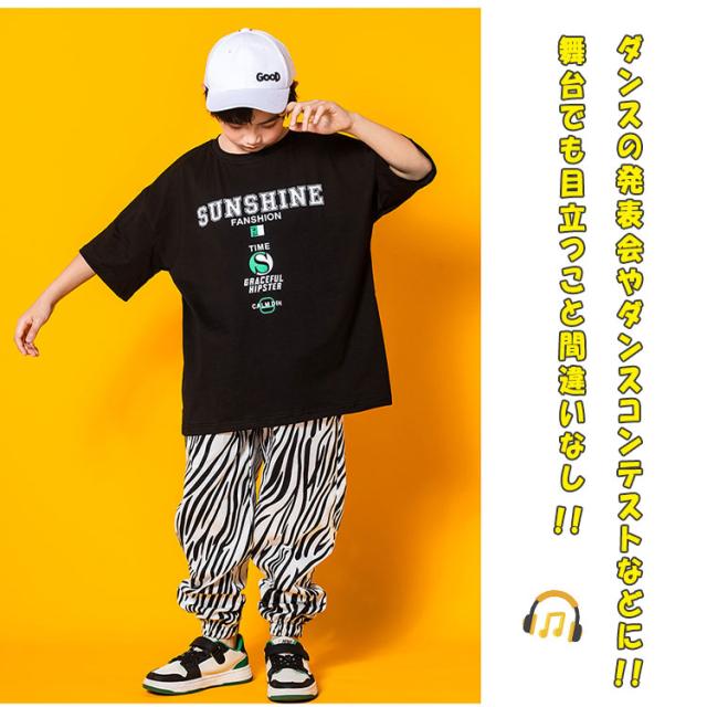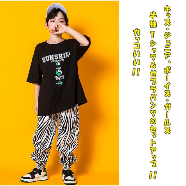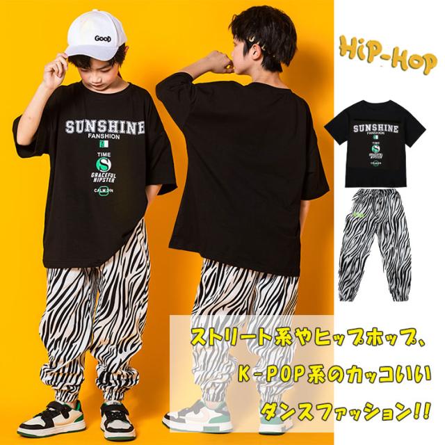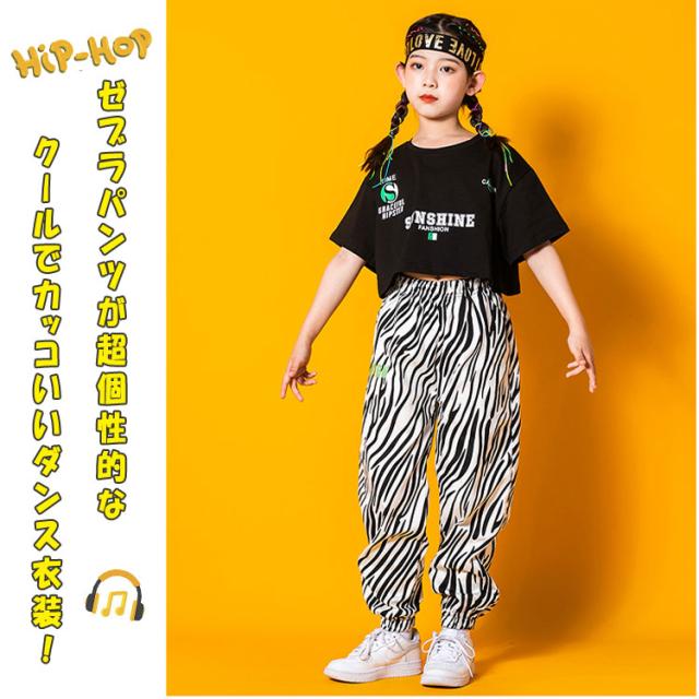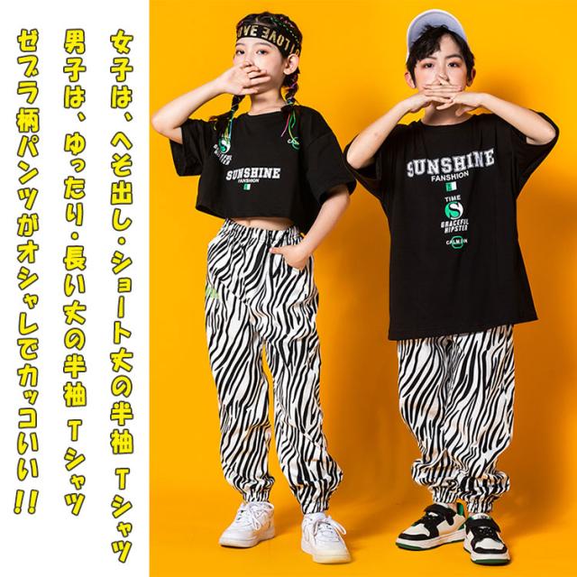 ヒップホップ ダンス ダンス衣装 キッズ 男の子 女の子 ジュニア 上下セットアップ 半袖tシャツ 長ズボン 女子 ショート丈tシャツ 可愛い へそ出し ゼブラ柄パンツ ヒップホップダンス ストリート系 K-POP系 ジャズダンス レッスン 発表会 舞台