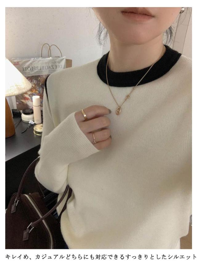 | 【バイカラー】【4color】 配色デザインがスタイリングを引き締め、旬の印象をプラスします。 キレイめ、カジュアルどちらにも対応できるすっきりとしたシルエット インもアウトもしやすい、ちょうどいい丈感。 デコルテ周りが綺麗見えする、絶妙なクルーネックも洗練された印象に。 伸縮性のある柔らかいニットを使用し、着心地リラクシーなのも嬉しいポイント。 | |