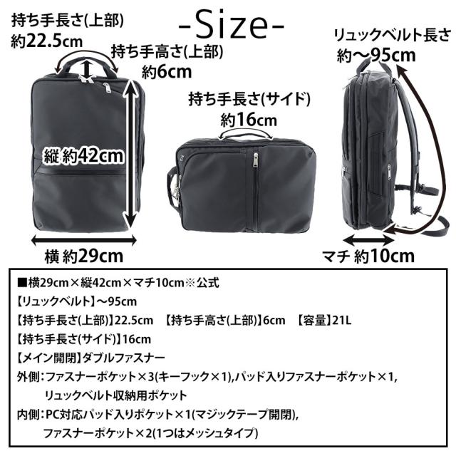 | サイズ(約) ※当店実寸値 | 公式サイズ 横29cm×縦42cm×マチ10cm 【持ち手高さ(上部)】6cm 【持ち手長さ(上部)】22.5cm 【持ち手長さ(サイド)】16cm 【リュックベルト】〜95cm 【容量】21L | ||