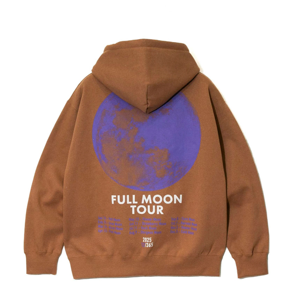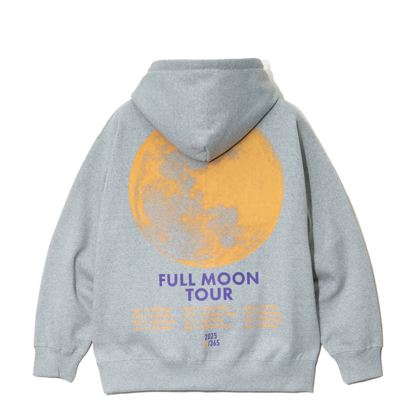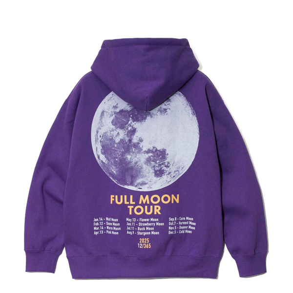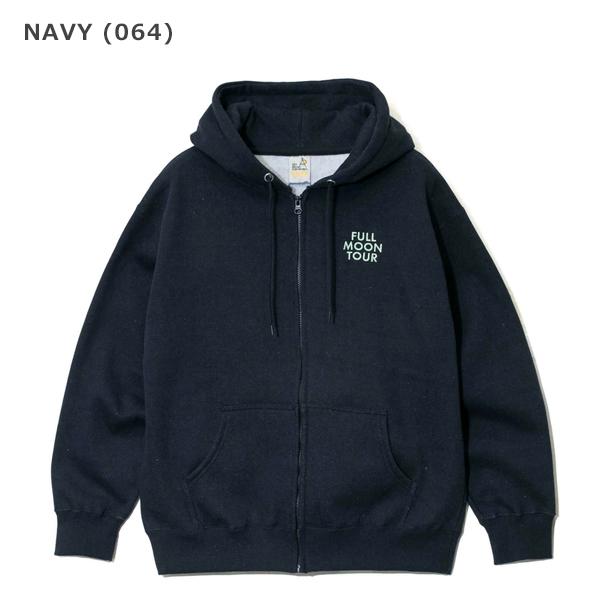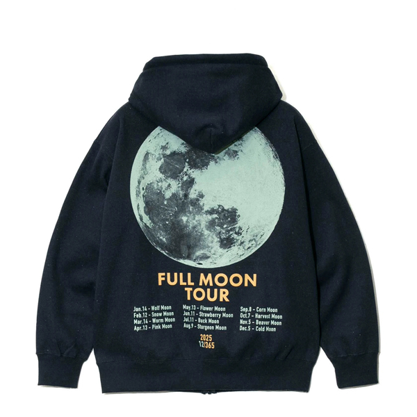 大きな満月《FULL MOON》がプリントされた人気シリーズ 今季は月ごとの満月の呼び名に加えスケジュールもプリントされたツアーTシャツ風のグラフィック。 FULL MOONシリーズ初のジップパーカー eco lead?を使用した裏起毛スウェット生地をオリジナルで編み立てました。 しっかりとした厚みがあり軽くて暖かい素材です。 | ||||||