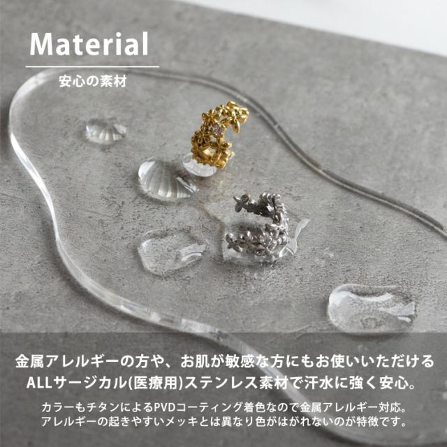 素材には金属アレルギーの方にも安心なサージカルステンレスを使用。使い勝手の良さとデザインが魅力的なステンレスイヤーカフを是非お試しください。シルバーやホワイトゴールド、プラチナで金属アレルギーが出てしまう方にもオススメです。