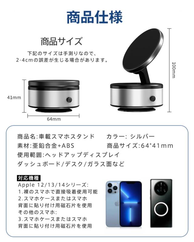 電動真空吸着式 スマホスタンド マグネット式 magsafe式 電動真空吸着式 超強力 Magsafe 超強吸着力 スマホホルダー 車載ホルダー 安定性抜群 携帯ホルダー 取り付け簡単 卓上スタンド ワイヤレス機種 繰り返す