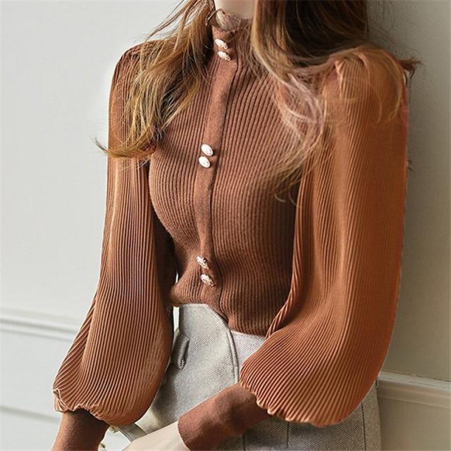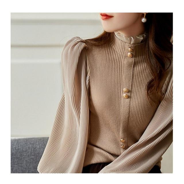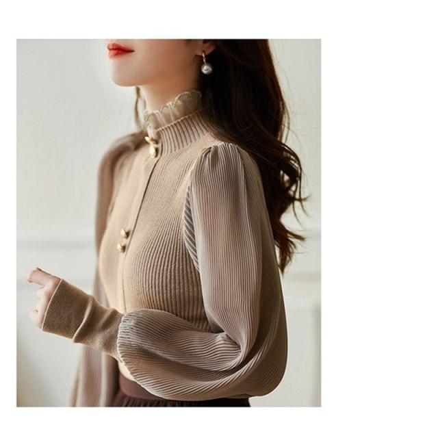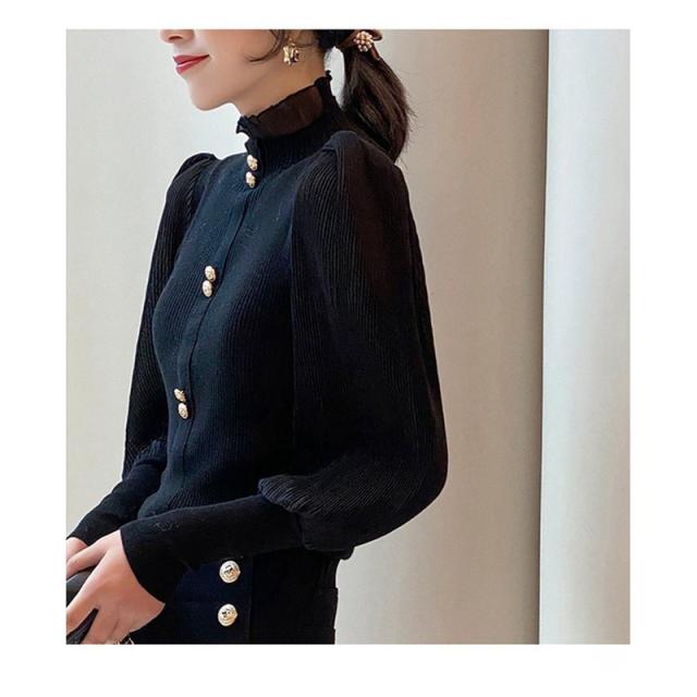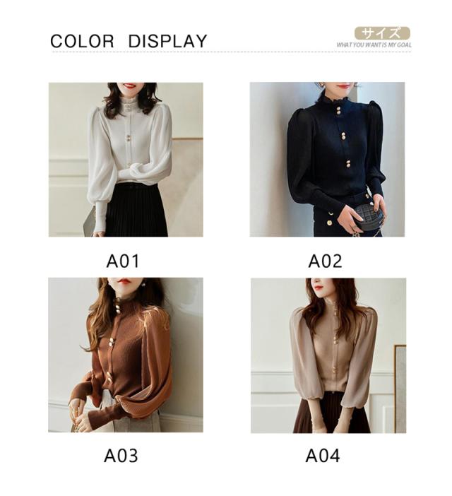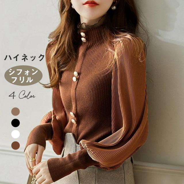 ニットシャツ レディース 長袖 ゆったり ボリューム袖シャツ 一部即納 シフォン ハイネック フリル ブラウス トップス 体型カバー 春秋 シンプル おしゃれ