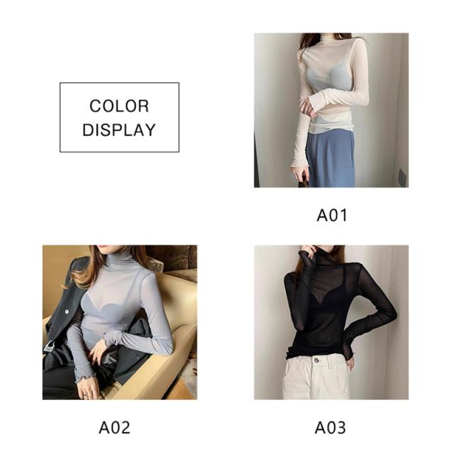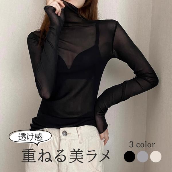 トップス カットソー インナー Tシャツ レディース 長袖 透け感 春 夏 秋 冬 フリル 細身 重ね着 無地 ハイネック 薄手 ストレッチ