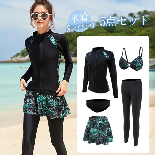 水着 ペアルック レディース ワイヤーあり 長袖 上下5点セット ラッシュガード フィットネス水着 水陸両用 紫外線対策 切替 レギンス ダイビング
