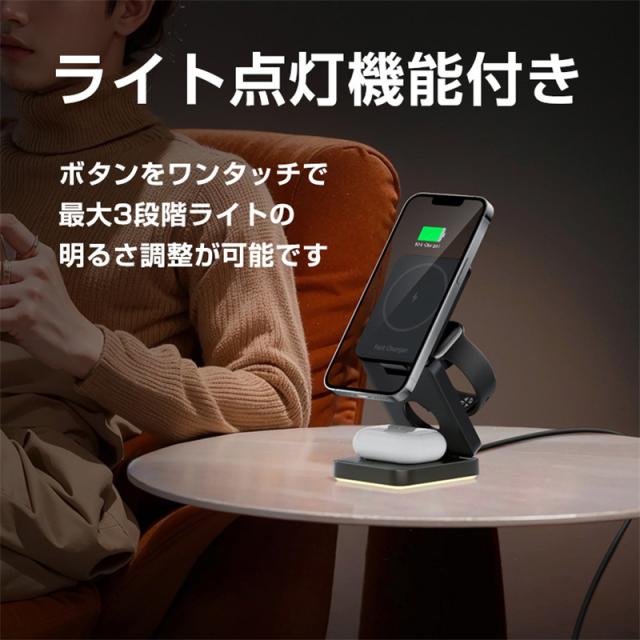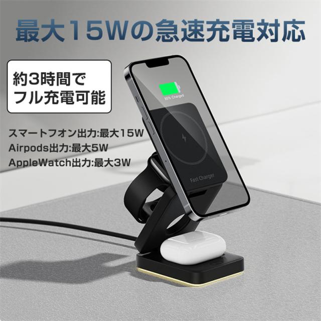 ワイヤレス充電器 3in1 MagSafe iphone15 マグネット充電器 アップルウォッチ 置くだけ 急速充電 スタンド 折り畳み式 コンパクト