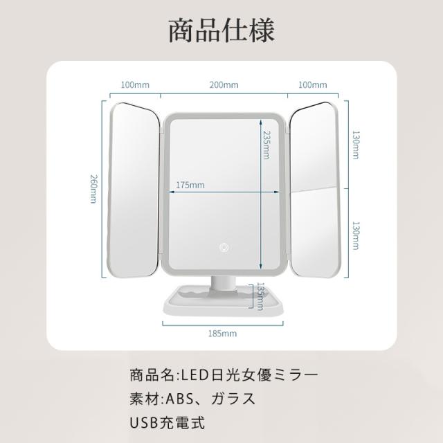 LED 卓上ミラー 三面鏡 ミラー キルティング調 折りたたみ 明るさ調整 角度調整 おしゃれ メイクミラー ハリウッドミラー 母の日 三色調光