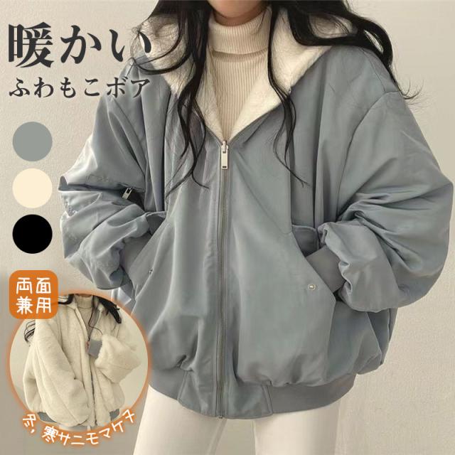 ジャケット レディース ブルゾン 冬 裏ボア 両面兼用 アウター フード付き 一部即納 厚手 もこもこ ふわふわ 大きいサイズ フリース あったか 送料無料
