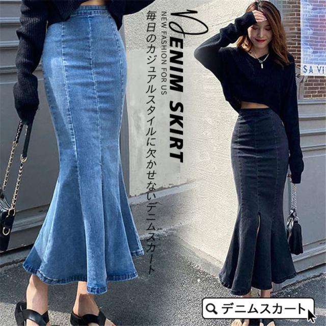 デニムスカート マーメイドスカート レディース タイトスカート ロングスカート スリット ボトムス 切替 無地 ハイウエスト シンプル 無地 送料無料