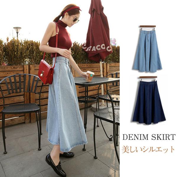 デニムスカート レディース ロング フレアスカート 一部即納 マキシ丈 ボトムス きれいめ 可愛い お洒落 無地 Aライン ゆったり 春夏秋冬 通勤 着やせ
