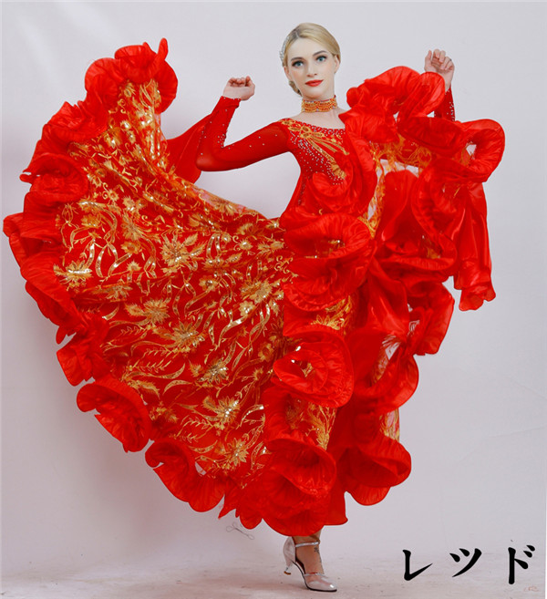 社交ダンス 衣装 モダンドレス ラテンドレス ラテン衣装 社交ダンスドレス 大きい裾 豪華なドレス ダンス衣装 ワンピース S~2XL ダンス衣装 ダンス発表会 競技着 練習着 演出用 スタンダードドレス ワルツダンス