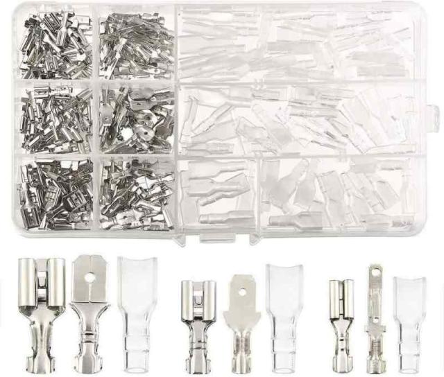 【セット内容】平型端子(2.8mm、4.8mm、6.3mmオス・メス各30個)、端子用絶縁スリーブ90個、合計270個セット。プラスチック収納ケース付き。プラスチック収納ケース付き。