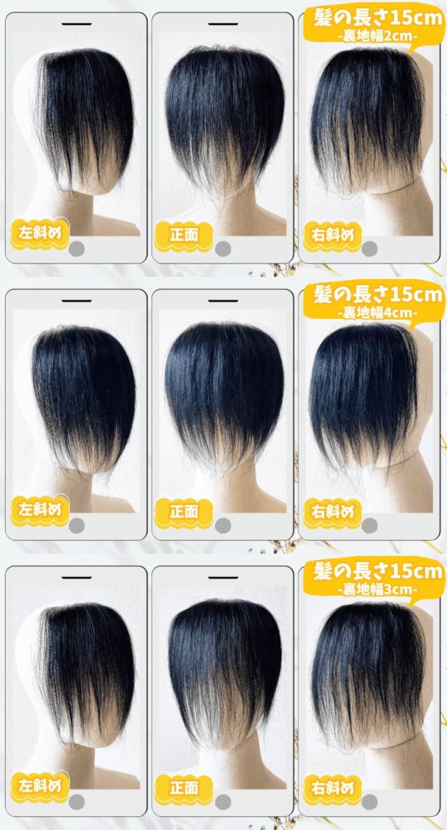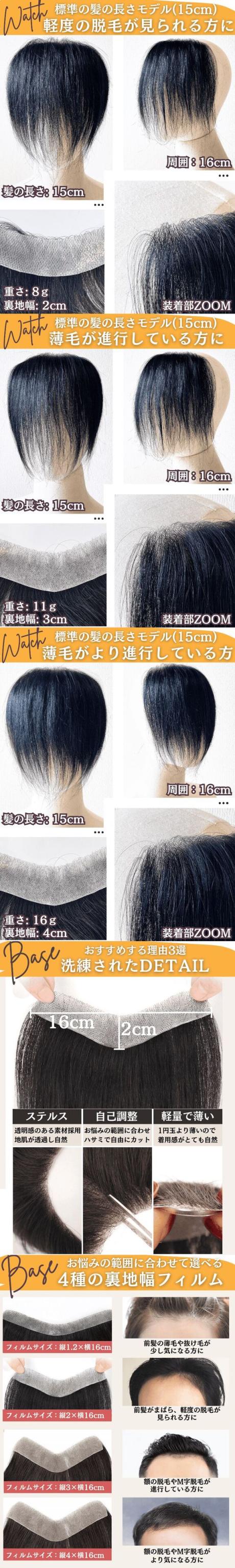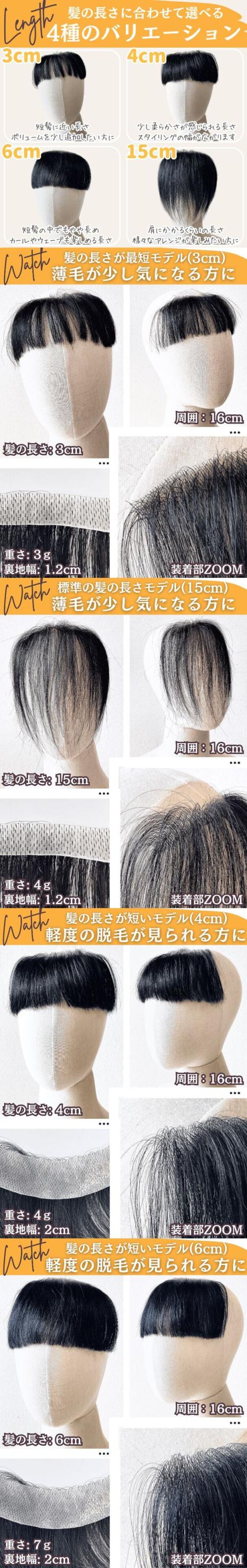 シートサイズ:1.2cm×16cm / 髪の長さ:3cm / 重さ : 3g シートサイズ:1.2cm×16cm / 髪の長さ:15cm / 重さ : 4g |