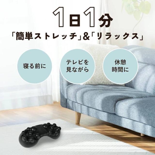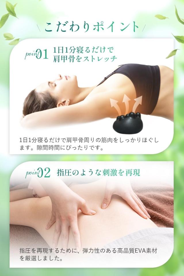 【1日1分 簡単マッサージ】仰向けの状態で肩甲骨の下に本商品を置いて1分ほど寝るだけで肩甲骨のマッサージがかんたんにできるツボ押し器です。1日1分のかんたん肩甲骨はがしを手軽にお楽しみください。