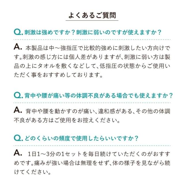 - まだ届いて数回しか使ってないですが、思ったよりしっかりした造りで、 背中、肩甲骨周りのコリの強いところに効いてる感覚はあります。 続けて使っていくことで、どこまで楽になるか楽しみです。